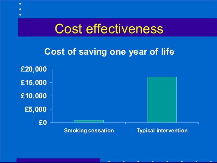 Cost effectiveness comparisons • Smoking cessation < £ 1, 000 • Statins £ 6, 000 -£ 13, 000 • Benchmark £ 30, 000?