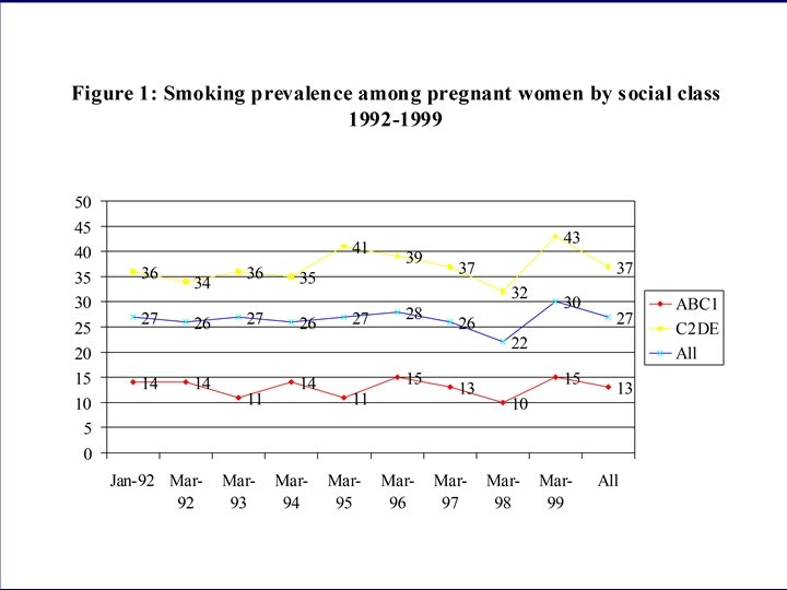 UK Smoking Summary • 28% men, 28% women smoked in 1996, decline in adults plateauing, possibly increasing again • No changes in young peoples’ smoking • No changes in pregnant womens’ smoking • Large socioeconomic differences