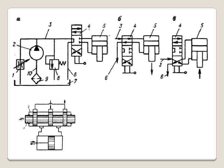 Sur la fig. 1 est représenté le plus simple schéma d’un commande hydraulique. . Si le tiroir de la valve de commande se deplace en haut le liquide se passe par la valve de commande et entre dans la chambre inférieure (creux de la tige) du cylindre 5. La pression du liquide refoule le piston vers le haut. Simultanément, s’effectue la vidange de la chambre supérieure du cylindre. La pompe doit être munie d’un regulateur automatique de décharge 8 qui met la pompe en marche à vide des que la pression dans le système atteint sa valeur maximale. La vitesse du piston depend de la résistance hydraulique du ralentisseur hydraulique (clapet de laminage) 1.