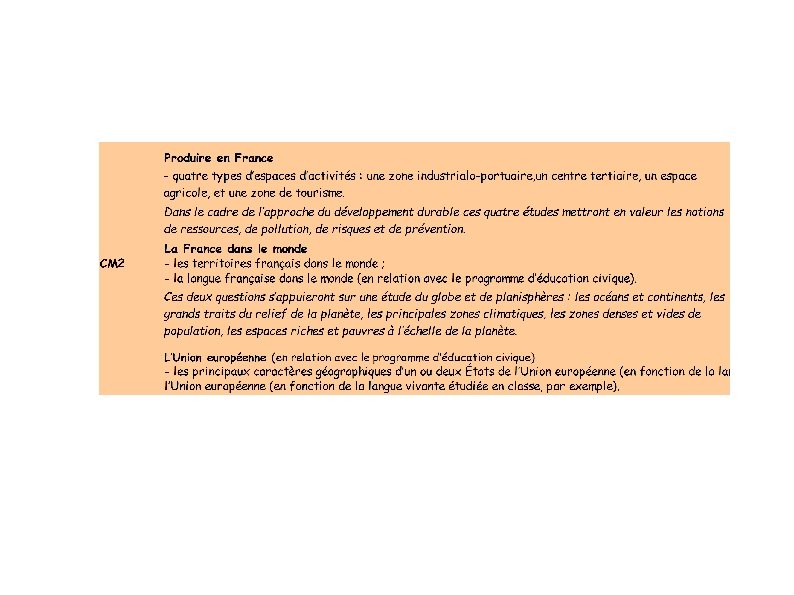 À la fin du CM 2, les élèves doivent être capables de : En géographie identifier et connaître par la fréquentation régulière du globe, de cartes et de paysages quelques caractères principaux des grands ensembles physiques et humains de l’échelle locale à celle du monde pour décrire et comprendre la diversité de la vie des hommes sur la terre ; lire et utiliser différents langages : cartes, croquis, graphiques, chronologie, documents iconographiques. Et en Histoire Identifier les principales périodes de l'histoire, de mémoriser quelques repères chronologiques pour les situer les uns par rapport aux autres en connaissant une ou deux de leurs caractéristiques majeures.