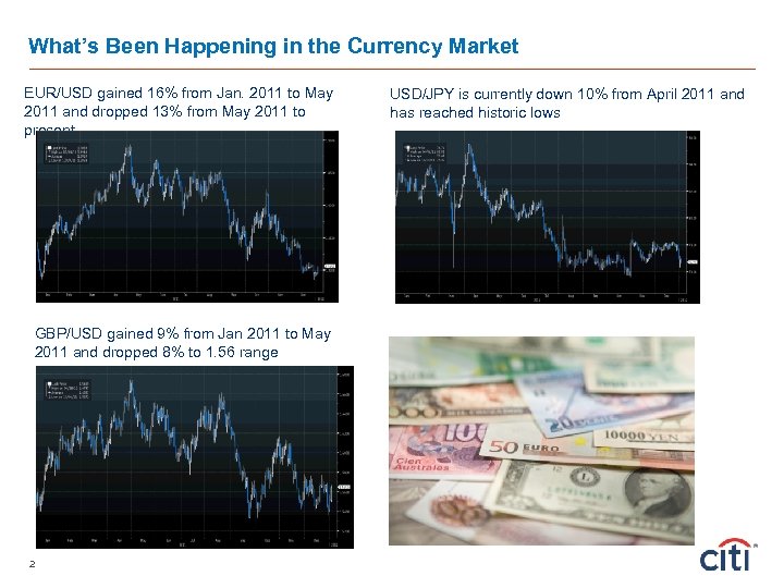 What’s Been Happening in the Currency Market EUR/USD gained 16% from Jan. 2011 to May 2011 and dropped 13% from May 2011 to present GBP/USD gained 9% from Jan 2011 to May 2011 and dropped 8% to 1. 56 range 2 USD/JPY is currently down 10% from April 2011 and has reached historic lows