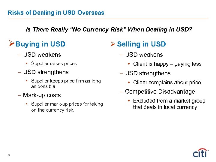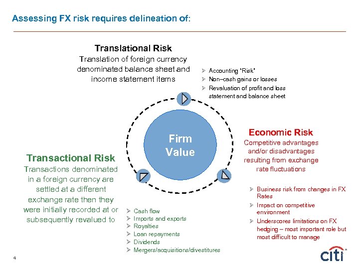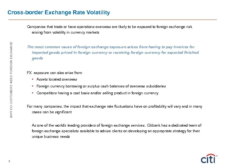 Cross-border Exchange Rate Volatility WHY DO CUSTOMERS NEED FOREIGN EXCHANGE Companies that trade or have operations overseas are likely to be exposed to foreign exchange risk arising from volatility in currency markets The most common cause of foreign exchange exposure arises from having to pay invoices for imported goods priced in foreign currency or receiving foreign currency for exported finished goods FX exposure can also arise from: § Assets located overseas § Foreign currency borrowing or surplus cash balances of overseas subsidiaries § Competitors having a cost basis and/or selling product in foreign currency For many companies, the impact that exchange rate fluctuations have on profitability will vary and in many cases can be significant As one of the world's leading providers of foreign exchange services, Citibank has a dedicated team of foreign exchange specialists available to advise clients on developing an appropriate strategy for their unique business needs 3
