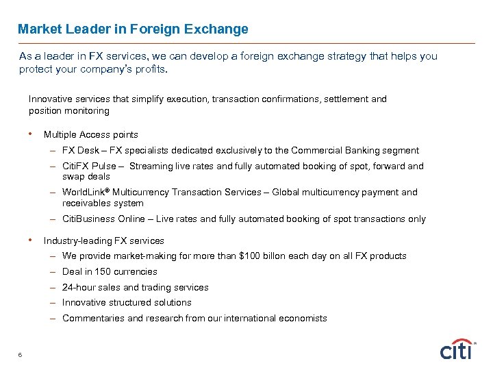 Market Leader in Foreign Exchange As a leader in FX services, we can develop a foreign exchange strategy that helps you protect your company’s profits. Innovative services that simplify execution, transaction confirmations, settlement and position monitoring • Multiple Access points – FX Desk – FX specialists dedicated exclusively to the Commercial Banking segment – Citi. FX Pulse – Streaming live rates and fully automated booking of spot, forward and swap deals – World. Link® Multicurrency Transaction Services – Global multicurrency payment and receivables system – Citi. Business Online – Live rates and fully automated booking of spot transactions only • Industry-leading FX services – We provide market-making for more than $100 billon each day on all FX products – Deal in 150 currencies – 24 -hour sales and trading services – Innovative structured solutions – Commentaries and research from our international economists 6
