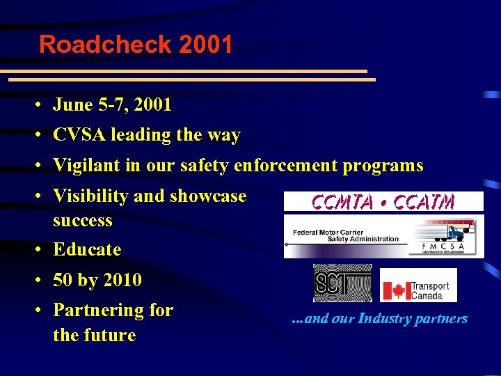 Roadcheck 2001 • June 5 -7, 2001 • CVSA leading the way • Vigilant in our safety enforcement programs • Visibility and showcase success • Educate • 50 by 2010 • Partnering for the future . . . and our Industry partners