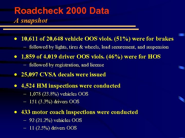 Roadcheck 2000 Data A snapshot · 10, 611 of 20, 648 vehicle OOS viols. (51%) were for brakes - followed by lights, tires & wheels, load securement, and suspension · 1, 859 of 4, 019 driver OOS viols. (46%) were for HOS - followed by registration, and license · 25, 097 CVSA decals were issued · 4, 524 HM inspections were conducted - 1, 078 (23. 8%) vehicles OOS - 151 (3. 3%) drivers OOS · 433 motor coach inspections were conducted - 92 (21. 2%) vehicles OOS - 11 (2. 5%) drivers OOS