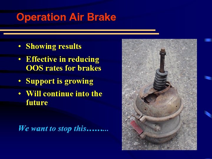 Operation Air Brake • Showing results • Effective in reducing OOS rates for brakes • Support is growing • Will continue into the future We want to stop this……. . .