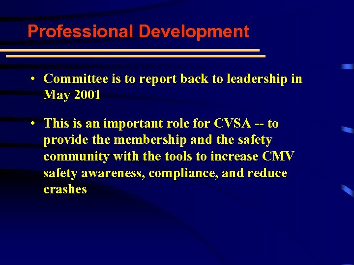 Professional Development • Committee is to report back to leadership in May 2001 • This is an important role for CVSA -- to provide the membership and the safety community with the tools to increase CMV safety awareness, compliance, and reduce crashes
