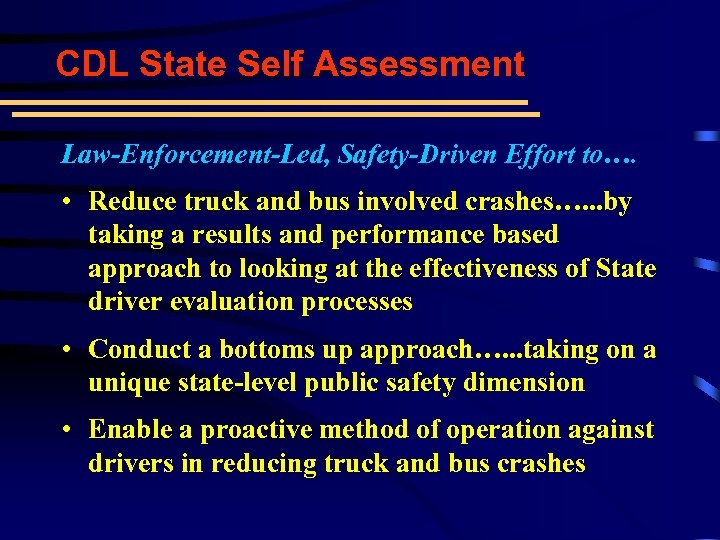 CDL State Self Assessment Law-Enforcement-Led, Safety-Driven Effort to…. • Reduce truck and bus involved crashes…. . . by taking a results and performance based approach to looking at the effectiveness of State driver evaluation processes • Conduct a bottoms up approach…. . . taking on a unique state-level public safety dimension • Enable a proactive method of operation against drivers in reducing truck and bus crashes