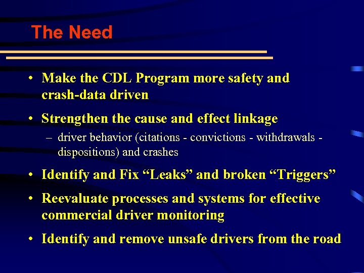 The Need • Make the CDL Program more safety and crash-data driven • Strengthen the cause and effect linkage – driver behavior (citations - convictions - withdrawals dispositions) and crashes • Identify and Fix “Leaks” and broken “Triggers” • Reevaluate processes and systems for effective commercial driver monitoring • Identify and remove unsafe drivers from the road