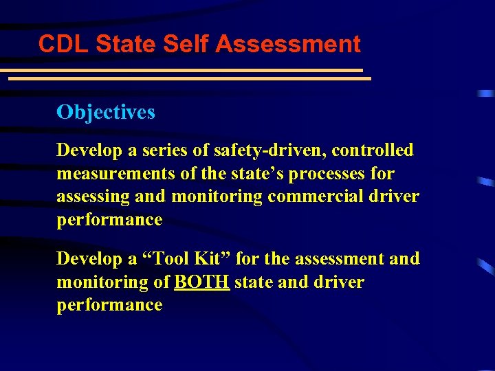 CDL State Self Assessment Objectives Develop a series of safety-driven, controlled measurements of the state’s processes for assessing and monitoring commercial driver performance Develop a “Tool Kit” for the assessment and monitoring of BOTH state and driver performance