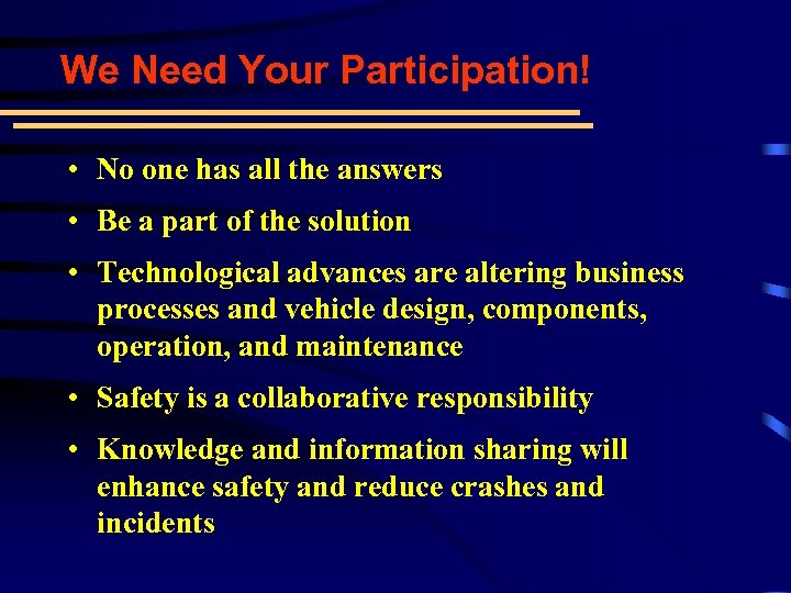 We Need Your Participation! • No one has all the answers • Be a part of the solution • Technological advances are altering business processes and vehicle design, components, operation, and maintenance • Safety is a collaborative responsibility • Knowledge and information sharing will enhance safety and reduce crashes and incidents