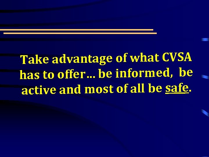 Take advantage of what CVSA has to offer… be informed, be active and most of all be safe.