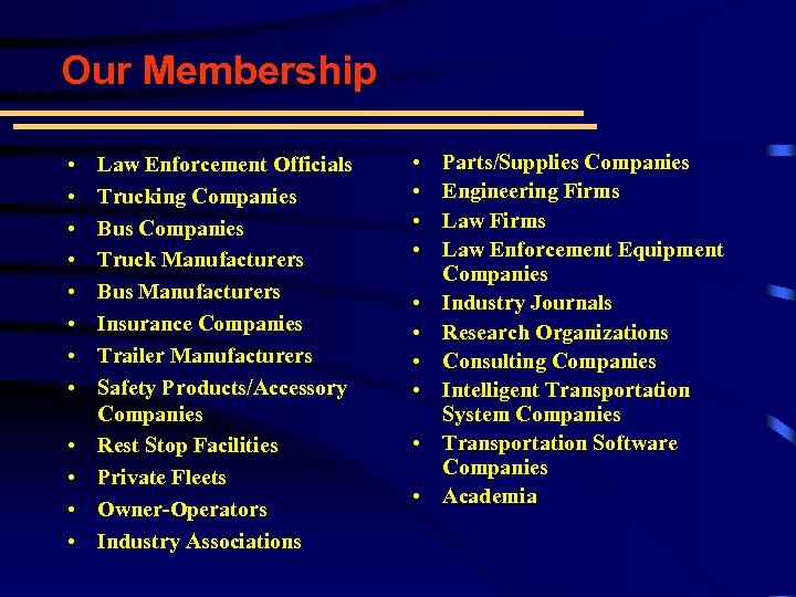 Our Membership • • • Law Enforcement Officials Trucking Companies Bus Companies Truck Manufacturers Bus Manufacturers Insurance Companies Trailer Manufacturers Safety Products/Accessory Companies Rest Stop Facilities Private Fleets Owner-Operators Industry Associations • • • Parts/Supplies Companies Engineering Firms Law Enforcement Equipment Companies Industry Journals Research Organizations Consulting Companies Intelligent Transportation System Companies Transportation Software Companies Academia