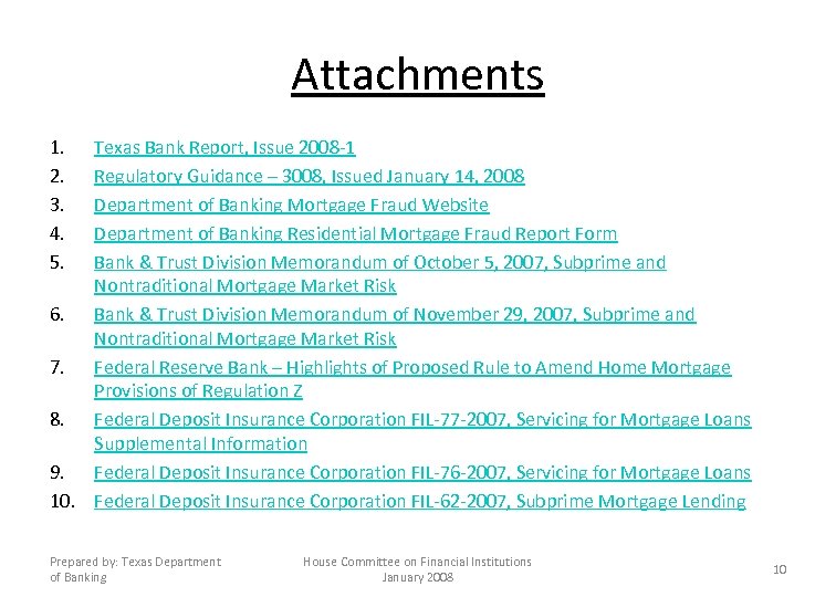 Attachments 1. 2. 3. 4. 5. Texas Bank Report, Issue 2008 -1 Regulatory Guidance – 3008, Issued January 14, 2008 Department of Banking Mortgage Fraud Website Department of Banking Residential Mortgage Fraud Report Form Bank & Trust Division Memorandum of October 5, 2007, Subprime and Nontraditional Mortgage Market Risk 6. Bank & Trust Division Memorandum of November 29, 2007, Subprime and Nontraditional Mortgage Market Risk 7. Federal Reserve Bank – Highlights of Proposed Rule to Amend Home Mortgage Provisions of Regulation Z 8. Federal Deposit Insurance Corporation FIL-77 -2007, Servicing for Mortgage Loans Supplemental Information 9. Federal Deposit Insurance Corporation FIL-76 -2007, Servicing for Mortgage Loans 10. Federal Deposit Insurance Corporation FIL-62 -2007, Subprime Mortgage Lending Prepared by: Texas Department of Banking House Committee on Financial Institutions January 2008 10