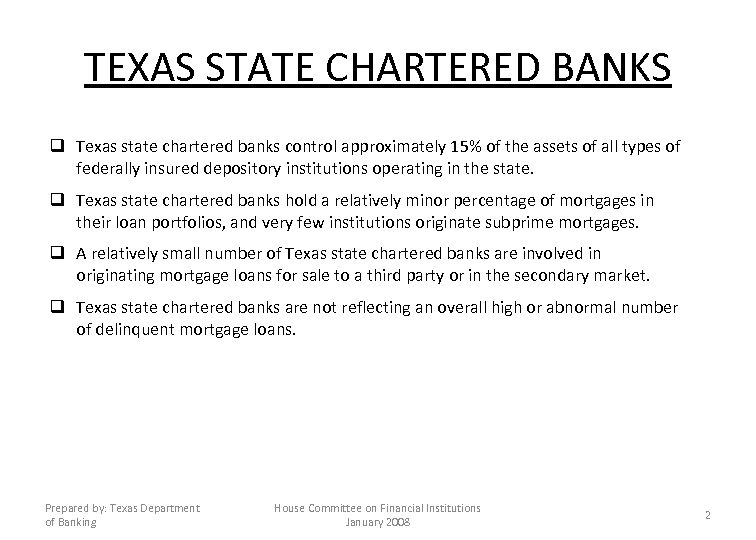 TEXAS STATE CHARTERED BANKS q Texas state chartered banks control approximately 15% of the assets of all types of federally insured depository institutions operating in the state. q Texas state chartered banks hold a relatively minor percentage of mortgages in their loan portfolios, and very few institutions originate subprime mortgages. q A relatively small number of Texas state chartered banks are involved in originating mortgage loans for sale to a third party or in the secondary market. q Texas state chartered banks are not reflecting an overall high or abnormal number of delinquent mortgage loans. Prepared by: Texas Department of Banking House Committee on Financial Institutions January 2008 2