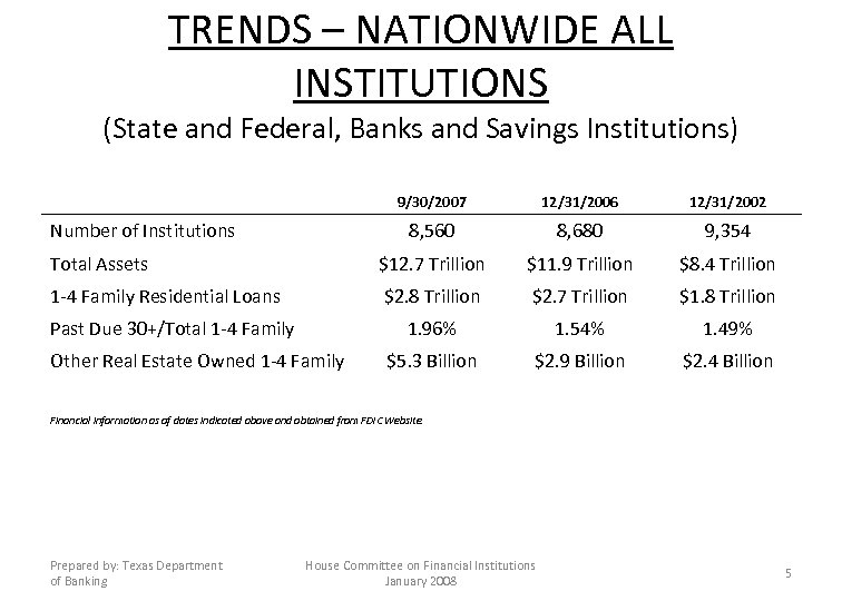 TRENDS – TEXAS STATE CHARTERED BANKS 9/30/2007(1) 12/31/2006(1) 12/31/2002(1) 327 322 337 Total Assets $88. 4 Billion $83. 9 Billion $62. 1 Billion 1 -4 Family Residential Loans $7. 3 Billion $7. 1 Billion $6. 7 Billion 1. 55% 1. 50% 1. 70% $28. 4 Million $19. 9 Million $15. 5 Million Number of Institutions Past Due 30+/Total 1 -4 Family Other Real Estate Owned 1 -4 Family Financial information as of dates indicated above and obtained from FDIC Website. (1) Before addition of Comerica Bank, which adds Total Assets of about $60. 1 billion effective 11/1/2007. Prepared by: Texas Department of Banking House Committee on Financial Institutions January 2008 4