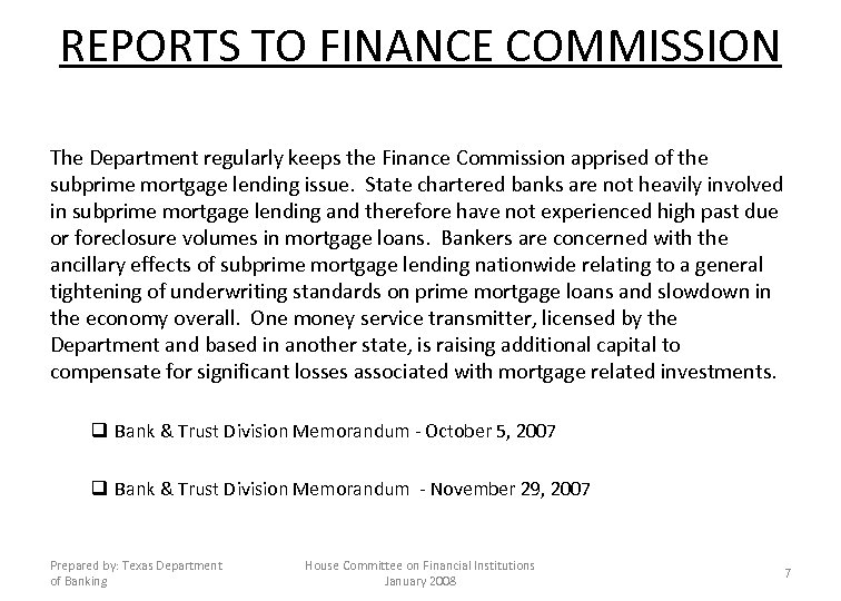 REPORTS TO FINANCE COMMISSION The Department regularly keeps the Finance Commission apprised of the subprime mortgage lending issue. State chartered banks are not heavily involved in subprime mortgage lending and therefore have not experienced high past due or foreclosure volumes in mortgage loans. Bankers are concerned with the ancillary effects of subprime mortgage lending nationwide relating to a general tightening of underwriting standards on prime mortgage loans and slowdown in the economy overall. One money service transmitter, licensed by the Department and based in another state, is raising additional capital to compensate for significant losses associated with mortgage related investments. q Bank & Trust Division Memorandum - October 5, 2007 q Bank & Trust Division Memorandum - November 29, 2007 Prepared by: Texas Department of Banking House Committee on Financial Institutions January 2008 7