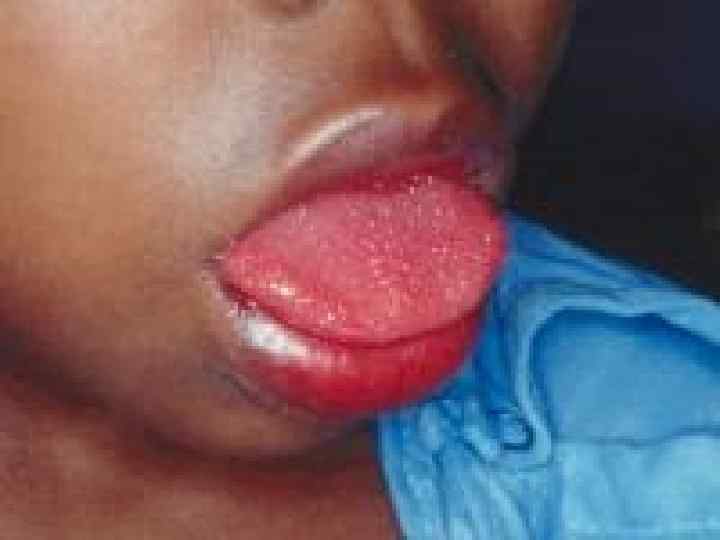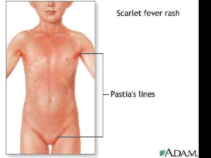 Skin rash scarlatina l l l generally starts on the chest, axilla , and behind the ears worse in the skin folds Pastia lines (small linear petechiae) appear and persist after the rash is gone Scarlet fever also produces a bright red tongue with a "strawberry" appearance. The area around the mouth is usually pale (circumoral pallor) After about a week, the skin often desquamates or peels, usually in the groin, axilla, and on tips of fingers and toes