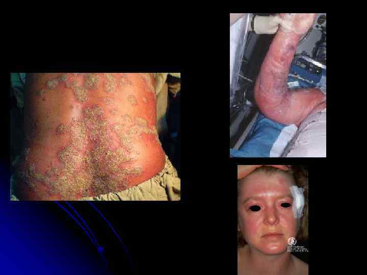 TOXIC SHOCK SYNDROME AND SCALDED SKIN SYNDROME Staphylococcus aureus exotoxins responsible for classic toxic shock syndrome and scalded skin syndrome. Presention : hypotension, erythema, fever and multisystem dysfunction. The rash : diffuse and can present as bullous impetigo, scarlatiniform lesions or diffuse erythema. The mucous membranes : spared