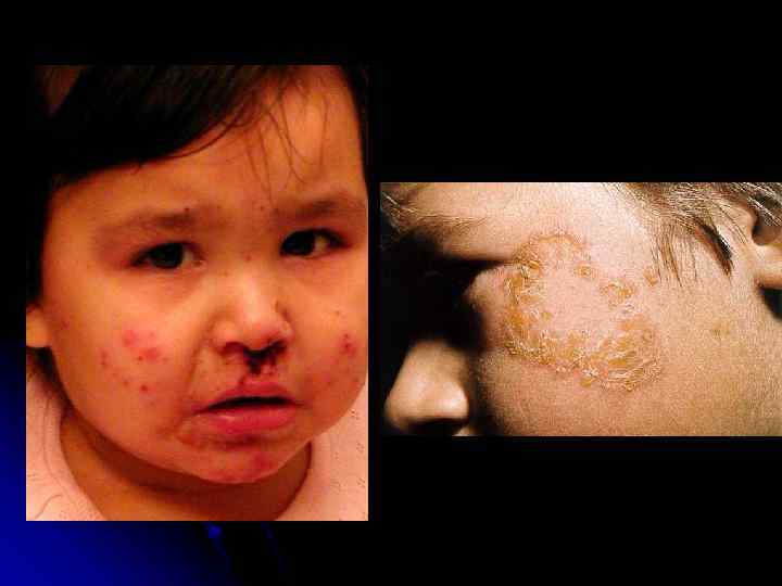 Impetigo Superficial infection of the dermis Two types: Impetigo contagiosa Bullous impetigo Etiology Group A ß hemolytic streptococcus Coagulase positive S. aureus Treatment : Keflex, erythromycin, Bactroban
