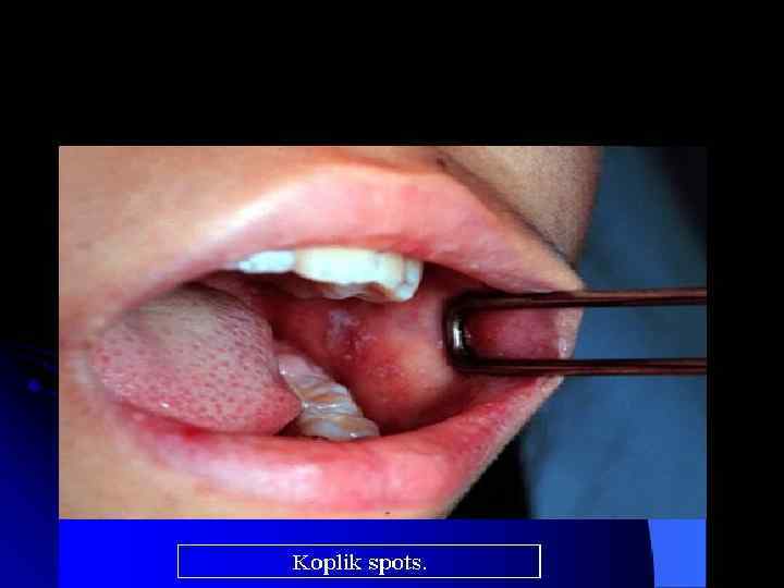 Symptoms l fever for at least three days, 40° Celsius. l Three Cs—cough, coryza (runny nose) conjunctivitis (red eyes) l Koplik's spots seen inside the mouth are pathognomonic transient and may disappear within a day of arising. l Maculopapular, erythematous rash that begins several days after the fever starts. It starts on the head before spreading to cover most of the body. The measles rash also classically "stains" by changing colour from red to dark brown before disappearing later. The rash can be itchy.