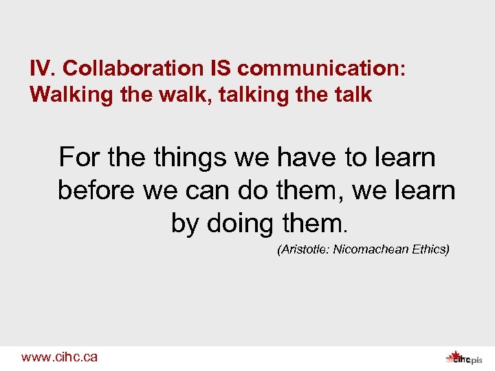 IV. Collaboration IS communication: Walking the walk, talking the talk For the things we have to learn before we can do them, we learn by doing them. (Aristotle: Nicomachean Ethics) www. cihc. ca