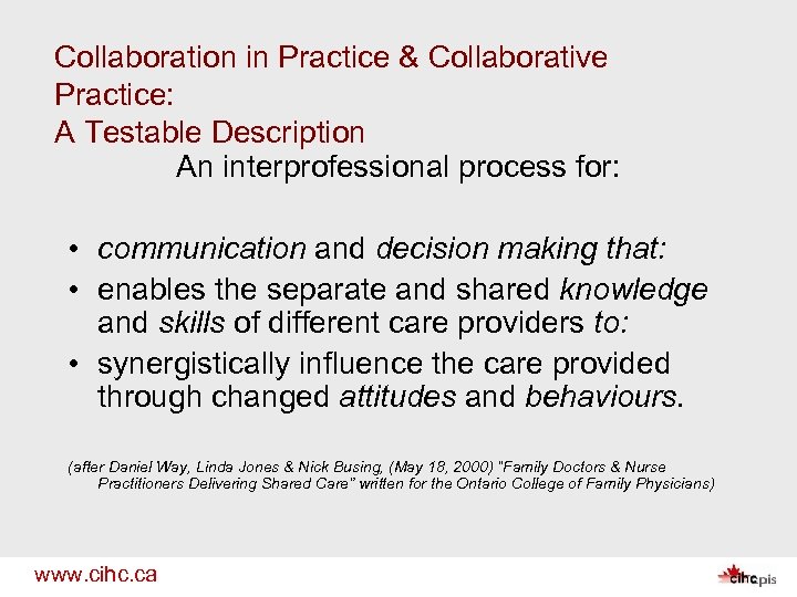 Collaboration in Practice & Collaborative Practice: A Testable Description An interprofessional process for: • communication and decision making that: • enables the separate and shared knowledge and skills of different care providers to: • synergistically influence the care provided through changed attitudes and behaviours. (after Daniel Way, Linda Jones & Nick Busing, (May 18, 2000) “Family Doctors & Nurse Practitioners Delivering Shared Care” written for the Ontario College of Family Physicians) www. cihc. ca