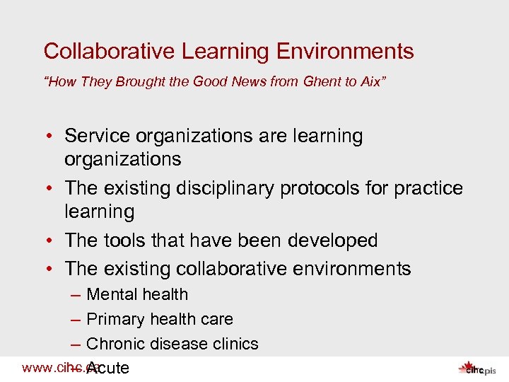 Collaborative Learning Environments “How They Brought the Good News from Ghent to Aix” • Service organizations are learning organizations • The existing disciplinary protocols for practice learning • The tools that have been developed • The existing collaborative environments – Mental health – Primary health care – Chronic disease clinics www. cihc. ca – Acute