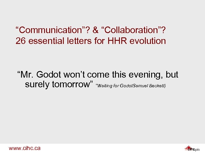 “Communication”? & “Collaboration”? 26 essential letters for HHR evolution “Mr. Godot won’t come this evening, but surely tomorrow” “Waiting for Godot. Samuel Beckett) www. cihc. ca