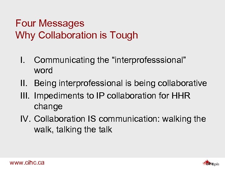 Four Messages Why Collaboration is Tough I. Communicating the “interprofesssional” word II. Being interprofessional is being collaborative III. Impediments to IP collaboration for HHR change IV. Collaboration IS communication: walking the walk, talking the talk www. cihc. ca