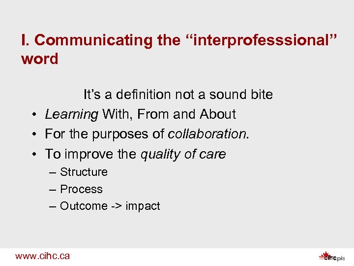 I. Communicating the “interprofesssional” word It’s a definition not a sound bite • Learning With, From and About • For the purposes of collaboration. • To improve the quality of care – Structure – Process – Outcome -> impact www. cihc. ca