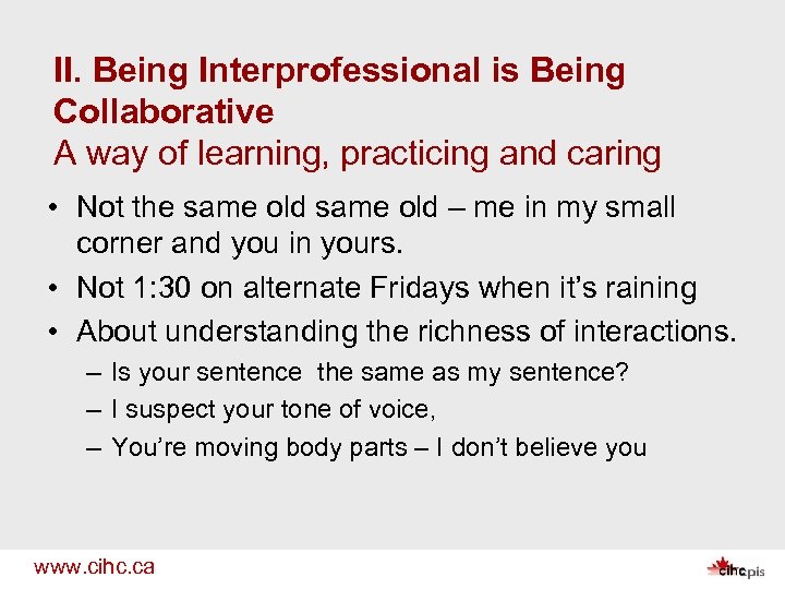 II. Being Interprofessional is Being Collaborative A way of learning, practicing and caring • Not the same old – me in my small corner and you in yours. • Not 1: 30 on alternate Fridays when it’s raining • About understanding the richness of interactions. – Is your sentence the same as my sentence? – I suspect your tone of voice, – You’re moving body parts – I don’t believe you www. cihc. ca