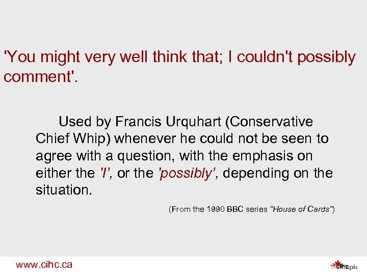 'You might very well think that; I couldn't possibly comment'. Used by Francis Urquhart (Conservative Chief Whip) whenever he could not be seen to agree with a question, with the emphasis on either the 'I’, or the 'possibly’, depending on the situation. (From the 1990 BBC series “House of Cards”) www. cihc. ca