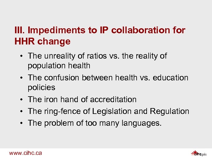 III. Impediments to IP collaboration for HHR change • The unreality of ratios vs. the reality of population health • The confusion between health vs. education policies • The iron hand of accreditation • The ring-fence of Legislation and Regulation • The problem of too many languages. www. cihc. ca