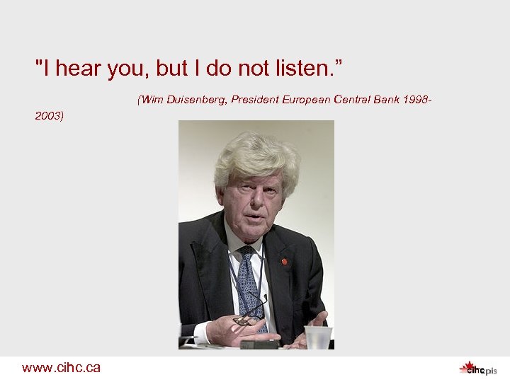 "I hear you, but I do not listen. ” (Wim Duisenberg, President European Central Bank 19982003) www. cihc. ca