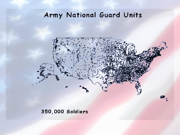 Overview of Army National Guard • Army National Guard is one component of the total U. S. Army. • ARNG is composed of civilians who serve their country on a part-time basis. • The ARNG has a dual mission, e. g. , state and federal.