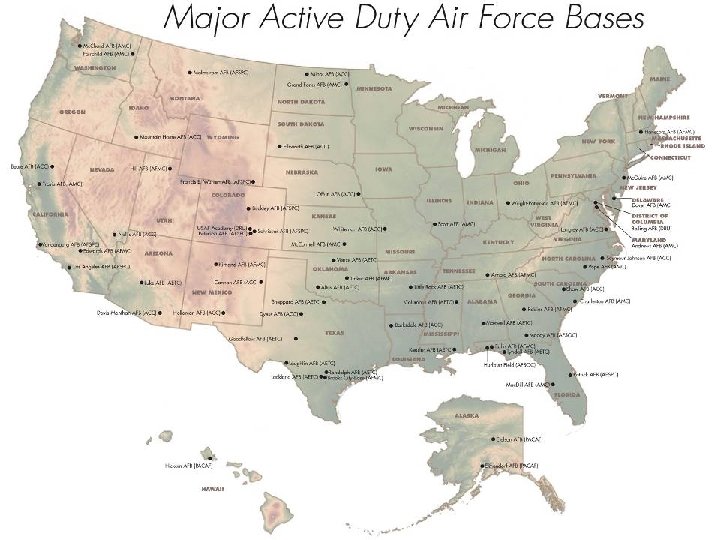Air Force Structure Active Component Major Commands Geographically Dispersed Bases Reserve Component Air National Guard States Major Commands Air Force Reserve Command 3 Numbered Air Forces 36 Wings