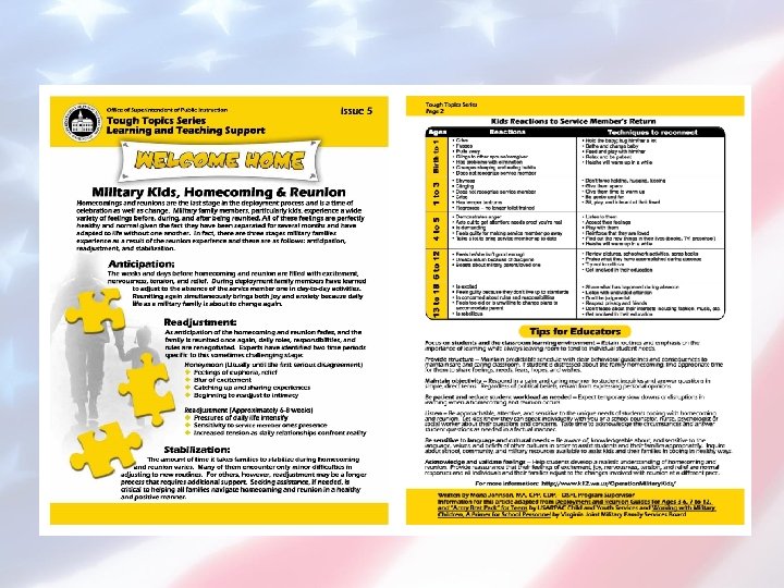 Social Issues and Needs • Adjusting to new or temporary family configuration • Managing new situations, especially being “suddenly military” • Accommodating physical changes • Making new contacts • Acclimating to new places • Coping with changing schools, sports leagues, or other out-of-school activities