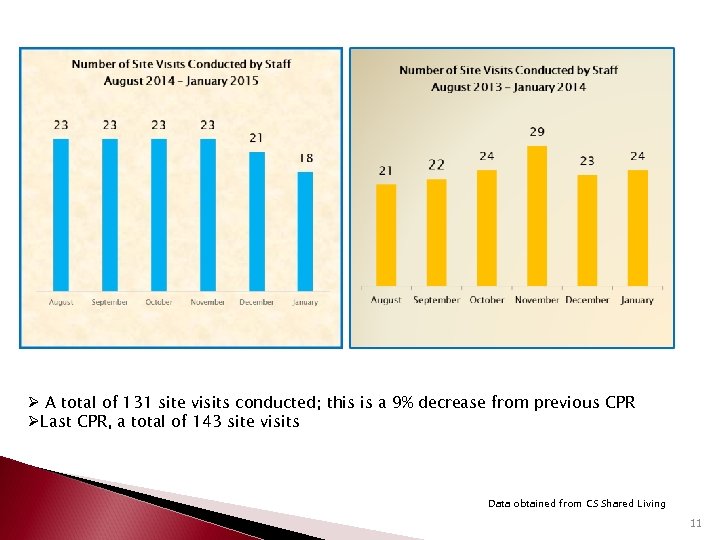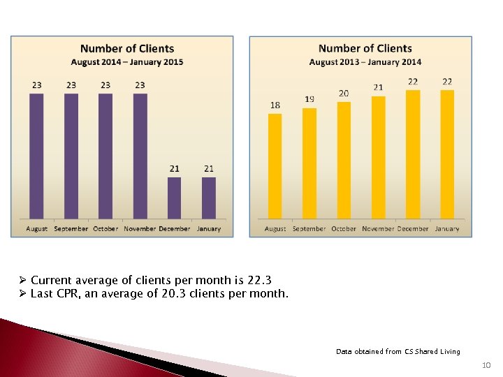 Ø Current average of clients per month is 22. 3 Ø Last CPR, an average of 20. 3 clients per month. Data obtained from CS Shared Living 10