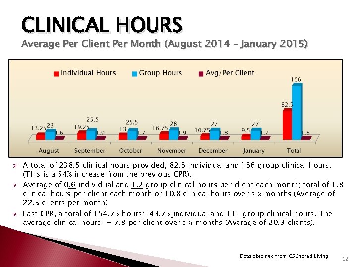 CLINICAL HOURS Average Per Client Per Month (August 2014 – January 2015) Ø Ø Ø A total of 238. 5 clinical hours provided; 82. 5 individual and 156 group clinical hours. (This is a 54% increase from the previous CPR). Average of 0. 6 individual and 1. 2 group clinical hours per client each month; total of 1. 8 clinical hours per client each month or 10. 8 clinical hours over six months (Average of 22. 3 clients per month) Last CPR, a total of 154. 75 hours: 43. 75 individual and 111 group clinical hours. The average clinical hours = 7. 8 per client over six months (Average of 20. 3 clients). Data obtained from CS Shared Living 12