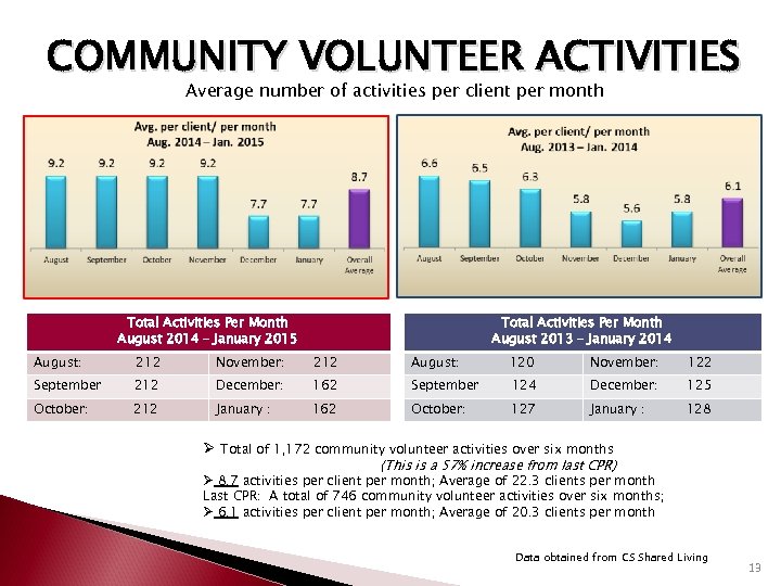 COMMUNITY VOLUNTEER ACTIVITIES Average number of activities per client per month Total Activities Per Month August 2014 – January 2015 Total Activities Per Month August 2013 – January 2014 August: 212 November: 212 August: 120 November: 122 September 212 December: 162 September 124 December: 125 October: 212 January : 162 October: 127 January : 128 Ø Total of 1, 172 community volunteer activities over six months (This is a 57% increase from last CPR) Ø 8. 7 activities per client per month; Average of 22. 3 clients per month Last CPR: A total of 746 community volunteer activities over six months; Ø 6. 1 activities per client per month; Average of 20. 3 clients per month Data obtained from CS Shared Living 13