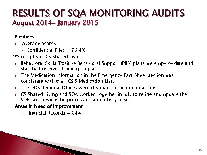 RESULTS OF SQA MONITORING AUDITS August 2014 - January 2015 Positives Average Scores ◦ Confidential Files = 96. 4% **Strengths of CS Shared Living Behavioral Skills/Positive Behavioral Support (PBS) plans were up-to-date and staff had received training on plans. The Medication Information in the Emergency Fact Sheet section was consistent with the HCSIS Medication List. The DDS Regional Offices were clearly documented in all files. CS Shared Living and SQA worked together in July to refine and update the SOPs and review the process on a quarterly basis Areas In Need of Improvement ◦ Financial Records = 84% 15