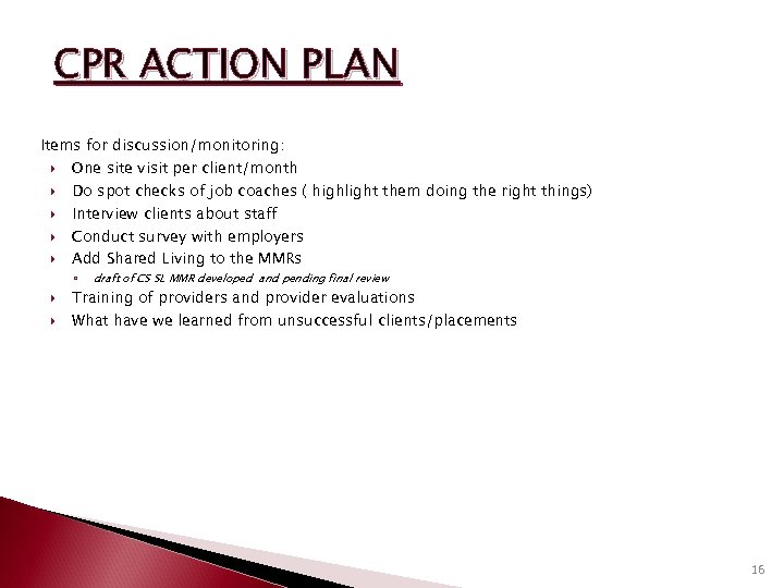 CPR ACTION PLAN Items for discussion/monitoring: One site visit per client/month Do spot checks of job coaches ( highlight them doing the right things) Interview clients about staff Conduct survey with employers Add Shared Living to the MMRs ◦ draft of CS SL MMR developed and pending final review Training of providers and provider evaluations What have we learned from unsuccessful clients/placements 16