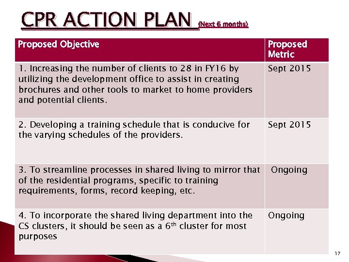 CPR ACTION PLAN (Next 6 months) Proposed Objective Proposed Metric 1. Increasing the number of clients to 28 in FY 16 by utilizing the development office to assist in creating brochures and other tools to market to home providers and potential clients. Sept 2015 2. Developing a training schedule that is conducive for the varying schedules of the providers. Sept 2015 3. To streamline processes in shared living to mirror that of the residential programs, specific to training requirements, forms, record keeping, etc. 4. To incorporate the shared living department into the CS clusters, it should be seen as a 6 th cluster for most purposes Ongoing 17