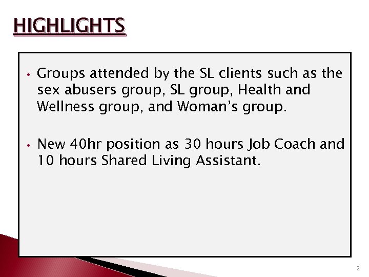 HIGHLIGHTS • • Groups attended by the SL clients such as the sex abusers group, SL group, Health and Wellness group, and Woman’s group. New 40 hr position as 30 hours Job Coach and 10 hours Shared Living Assistant. 2