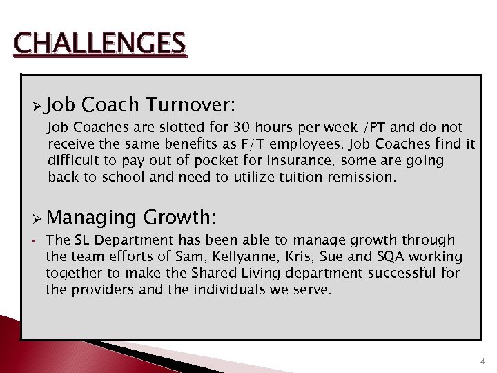 CHALLENGES Ø Job Coach Turnover: Job Coaches are slotted for 30 hours per week /PT and do not receive the same benefits as F/T employees. Job Coaches find it difficult to pay out of pocket for insurance, some are going back to school and need to utilize tuition remission. Ø Managing • Growth: The SL Department has been able to manage growth through the team efforts of Sam, Kellyanne, Kris, Sue and SQA working together to make the Shared Living department successful for the providers and the individuals we serve. 4