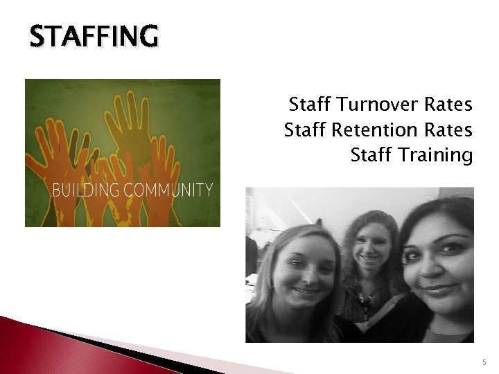 STAFFING Staff Turnover Rates Staff Retention Rates Staff Training 5