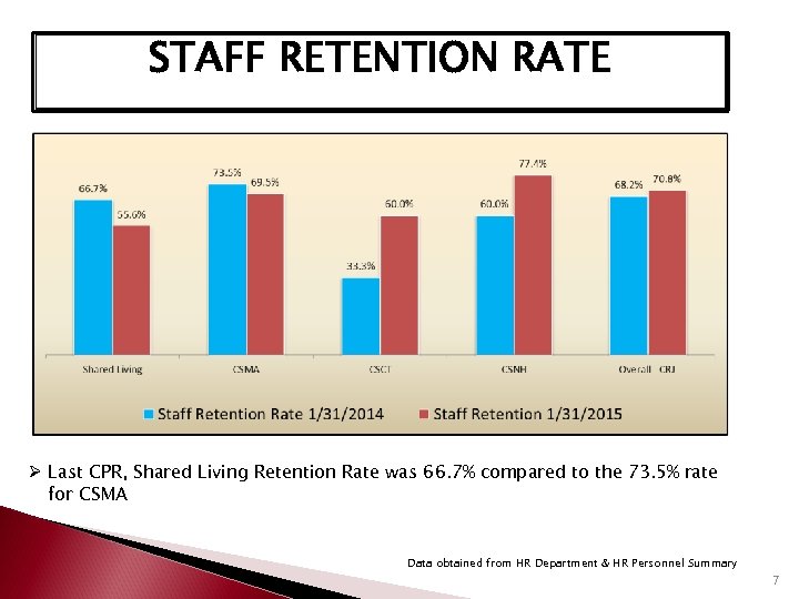 STAFF TURNOVER RATE Ø Last CPR, Shared Living Turnover Rate was 0% compared to the 26. 7% rate for CSMA Data obtained from HR Department & HR Personnel Summary 6