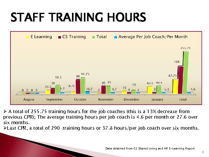 STAFF TRAINING HOURS Ø A total of 255. 75 training hours for the job coaches (this is a 13% decrease from previous CPR); The average training hours per job coach is 4. 6 per month or 27. 6 over six months. ØLast CPR, a total of 290 training hours or 37. 8 hours/per job coach over six months. Data obtained from CS Shared Living and HR E-Learning Report 8