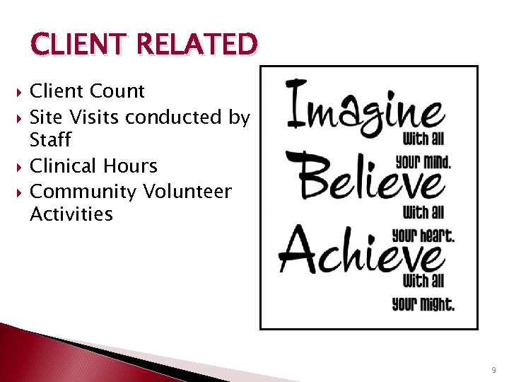 CLIENT RELATED Client Count Site Visits conducted by Staff Clinical Hours Community Volunteer Activities 9